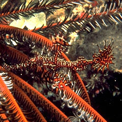 A ghost pipefish gets up close and personal with a crinoid, and almost blends into its surroundings.